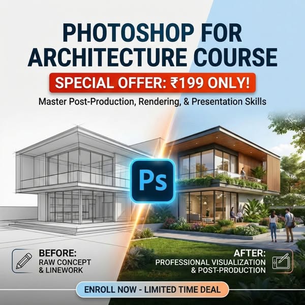 The Photoshop Course by Goblaze is specially designed for architecture and interior design visualization. Youβll learn how to enhance architectural drawings, render plans, create realistic presentations, add textures, lighting effects, landscaping, and post-production improvements to make your projects look professional and client-ready.